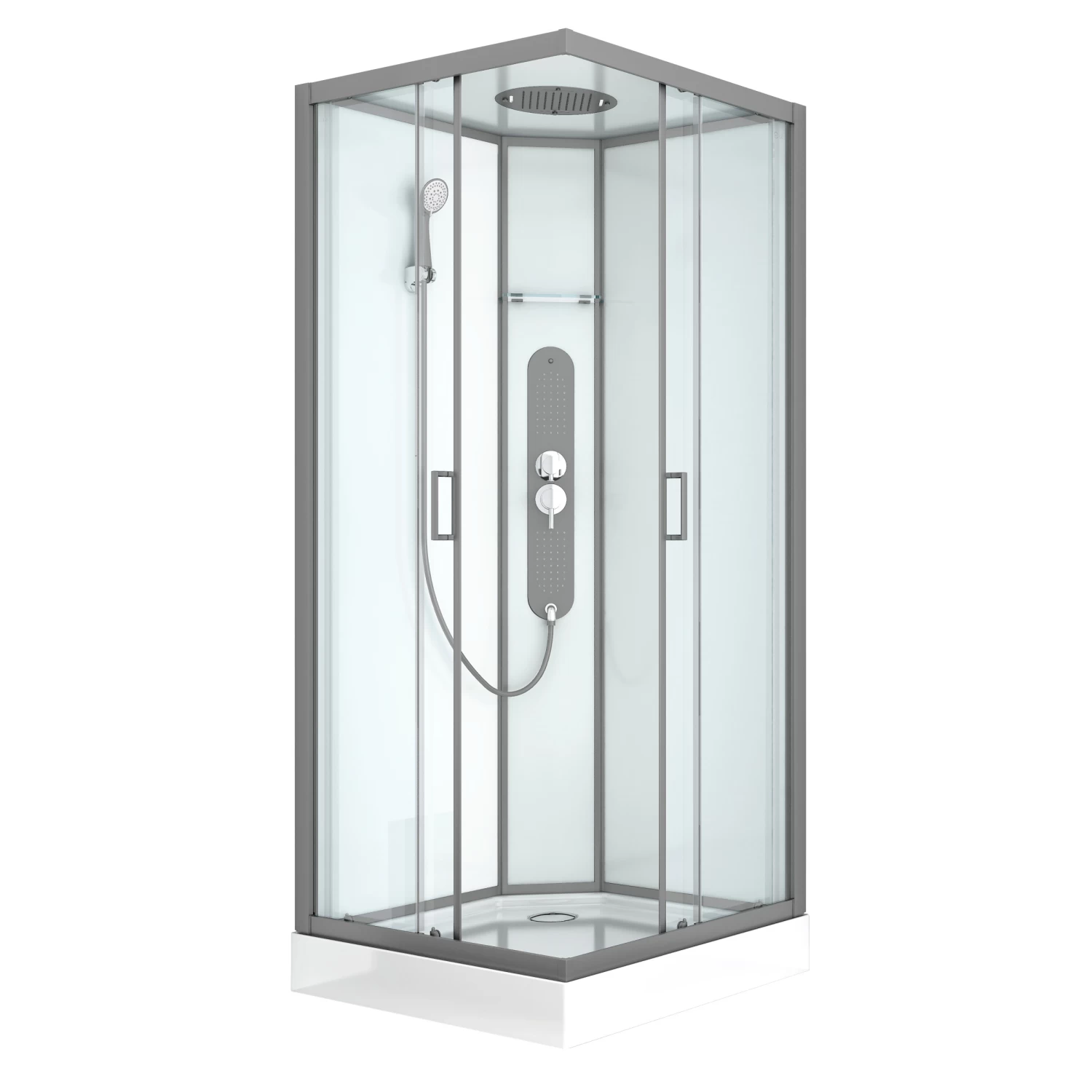 De Allibert douchecabine Uyuni 90×90 cm Hoekinstap is zeer eenvoudig te installeren met zijn clip-systeem en zonder boren, in 1 uur montage en zonder silicone. Deze complete douchecabine bestaat uit een douchetub in versterkt ABS, wanden en douchedeuren met anti-kalkbehandeling en een hoogwaardige kraan. De “minimalistische rechte” structuur is vervaardigd uit verchroomd aluminium. De deuren zijn transparant, de achterwanden in wit veiligheidsglas. Het gelakt zwart bedieningspaneel zorgt voor een perfecte afstelling van de waterhoeveelheid. De keuze is uitgebreid: hydromassagestralen, een handdouche met 3 functies, een zwart gelakt stalen douchekop van 25 x 25 cm geïntegreerd in het witte glazen dak.