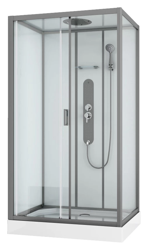 De Allibert douchecabine Uyuni hoekmodel 120×80 cm Gun Metal is zeer eenvoudig te installeren met zijn clip-systeem en zonder boren, in 1 uur montage en zonder silicone. Deze complete douchecabine bestaat uit een douchetub in versterkt ABS, wanden en douchedeuren met anti-kalkbehandeling en een hoogwaardige kraan. De “minimalistische rechte” structuur is vervaardigd uit verchroomd aluminium. De deuren zijn transparant, de achterwanden in wit veiligheidsglas. Het gelakt zwart bedieningspaneel zorgt voor een perfecte afstelling van de waterhoeveelheid. De keuze is uitgebreid: hydromassagestralen, een handdouche met 3 functies, een zwart gelakt stalen douchekop van 25 x 25 cm geïntegreerd in het witte glazen dak.
