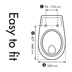 Door de verstelbaarheid in de scharnieren en de ovale vorm past de bril op de meeste gangbare toiletpotten, toch raden we je aan de lijntekening goed te bekijken zodat hij netjes past op jouw pot. Tenslotte monteer je de bril met het doordachte ‘Fastfix’ bevestigingssysteem eenvoudig vanaf de onderkant.