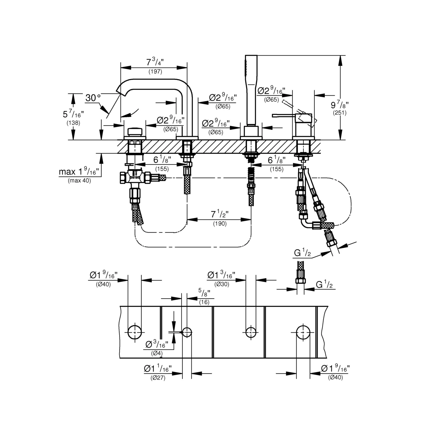 De GROHE Colours Badrandcombinatie Essence New 4-delig Grafiet is een prachtige elegante kraan die ín de badrand gemonteerd wordt. De 4-gats kraan met handdouche en de licht gebogen kraan uitloop van 25,1 cm hoog hebben daardoor een minimalistische uitstraling. De afwerking met de extra bestendige GROHE StarLight beschermlaag heeft de kleur Hard Graphite. Dat geeft een robuuste look en past daarmee perfect in ieder landelijke of industriële badkamer.