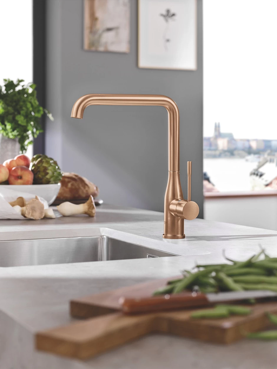 Deze keukenkraan hoort bij de Essence New serie. Die serie bestaat uit een variatie kranen in de kleuren grafiet (SuperSteel), koper (Warm Sunset) en RVS (SuperSteel). Dankzij de hoge uitloop van deze kraan is het gebruik enorm comfortabel. Ook heeft de kraan een maximaal draaibereik van 360°. Het draaibereik is in te stellen op 0°, 150° en 360°. Dankzij de relatief hoge L-uitloop kun je eenvoudig grote pannen omspoelen of emmers vullen. De Grohe SilkMove keramische schijven geven je de volledige controle over de temperatuur en waterstroom. Dankzij de Grohe StarLight beschermlaag is deze keukenkraan zeer krasbestendig en het maakt de kraan ook eenvoudig schoon te maken. De beschermlaag heeft echter geen invloed op wat je ziet. De kraan heeft een geborsteld RVS exterieur die binnen iedere stijl tot zijn recht komt. De Grohe Colours Keukenkraan Essence New Koper met L-uitloop wordt verkocht met flexibele aansluitslangen en handleiding. Mocht koper (Warm Sunset) toch niet helemaal jouw kleur zijn. Geen probleem! Je kunt deze keukenkraan ook in grafiet (Hard Graphite) of RVS (SuperSteel) kopen in de KARWEI webshop.