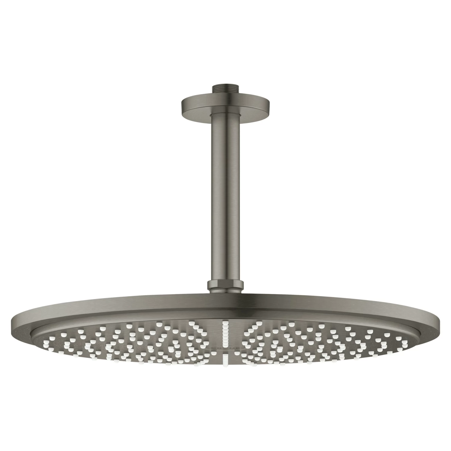 Ook altijd zo’n hekel aan douchen onder een veel te kleine douchekop? Nooit volledig onder de straal kunnen staan en het dus altijd wel ergens koud hebben. Dat is voorbij, want deze Grohe Colours Regendouchekop Essence New Inbouw Plafond Grafiet Ø31 cm heeft een diameter van maar liefst 31 cm. De douchekop heeft een douchearm van 14,2 cm aan de bovenzijde. Het is dus de bedoeling om deze douchekop aan het plafond te monteren. Daarnaast zit deze regendouche boordevol Duitse technologie. De Grohe DreamSpray zorgt ervoor dat het water gelijk verdeeld wordt over ieder sproeigaatje. De PuraRain Spray biedt grote, maar zachte druppels. In combinatie met een aangename temperatuur voelt dit als een zomerse regenbui. Met de Grohe EcoJoy verminder je het waterverbruik. Daardoor is dit ook een goede keuze voor de portemonnee! De siliconen SpeedClean sproeigaatjes zijn enorm eenvoudig te reinigen. Daardoor zul je veel minder last hebben van kalkaanslag en gaat de douchekop langer mee. Daarnaast heeft de regendouchekop een Grohe StarLight buitenlaag waardoor de kop krasbestendig is en, net als de sproeigaten, gemakkelijk schoon te maken zijn. Tot slot heeft de douchekop een Inner WaterGuide die ervoor zorgt dat de buitenkant van de douche niet te warm wordt van het water dat er doorheen stroomt. Dat waren de technische aspecten van de regendouche, maar het oog wil ook wat. Dat is waarom je in de KARWEI webshop de keuze hebt uit de kleuren grafiet (Hard Graphite), koper (Warm Sunset) en RVS (SuperSteel) met daar bovenop nog de keuze tussen de plafond- en wandmontage variant.