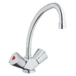 De Grohe Costa Trend tweeknops keukenkraan met hoge uitloop is een kraan met functionele insteek en is afgewerkt in het chroom. De kraan is voorzien van een draaibare uitloop die zorgt voor extra gebruiksgemak. De zwenkbaarheid per kraan kan verschillen. Een hogere uitloop is decoratief, maar ook erg praktisch. Je hebt hierdoor meer ruimte in voor bijvoorbeeld pannen en emmers in je gootsteen. Let we goed op dat de kraan onder bovenkastjes past.