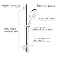 Bestaat uit: hand shower Vitalio SmartActive 150, glijstang 600 mm met metalen wandhouders, VitalioFlex Silver doucheslang 1750mm, GROHE EasyReach zeepschaal. GROHE EcoJoy 9,5 l/min. Doorstroombegrenzer. GROHE DreamSpray voor een optimaal straalbeeld. GROHE QuickFix Plus adjustable distance between brackets for adaption to existing drilling holes. GROHE TileFix instelbare diepte op bovenste wandhouder. SpeedClean anti-kalk systeem. Inner WaterGuide voor een langere levensduur. TwistFree voorkomt het meedraaien van de slang. Minimale dynamische druk 1,0 bar