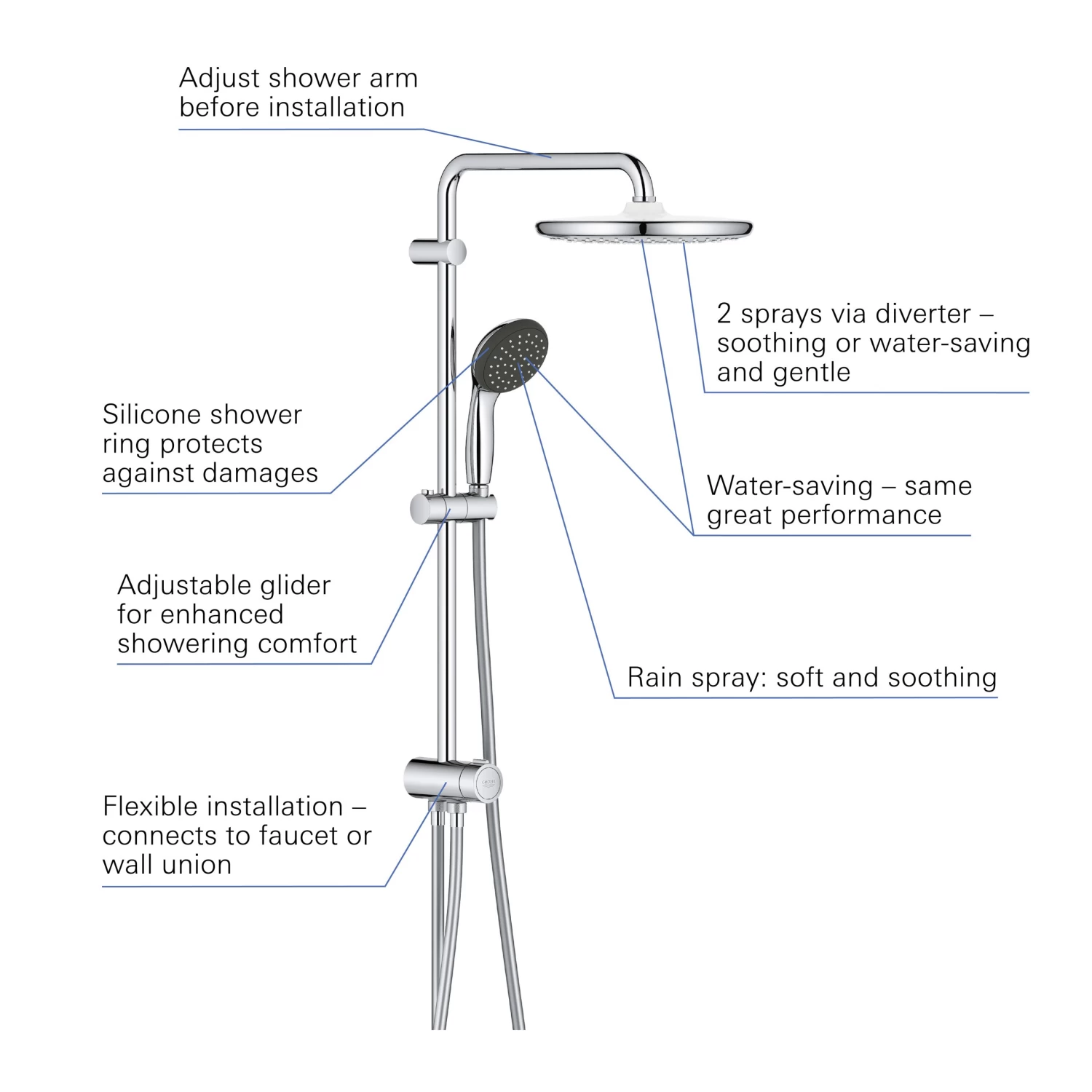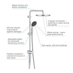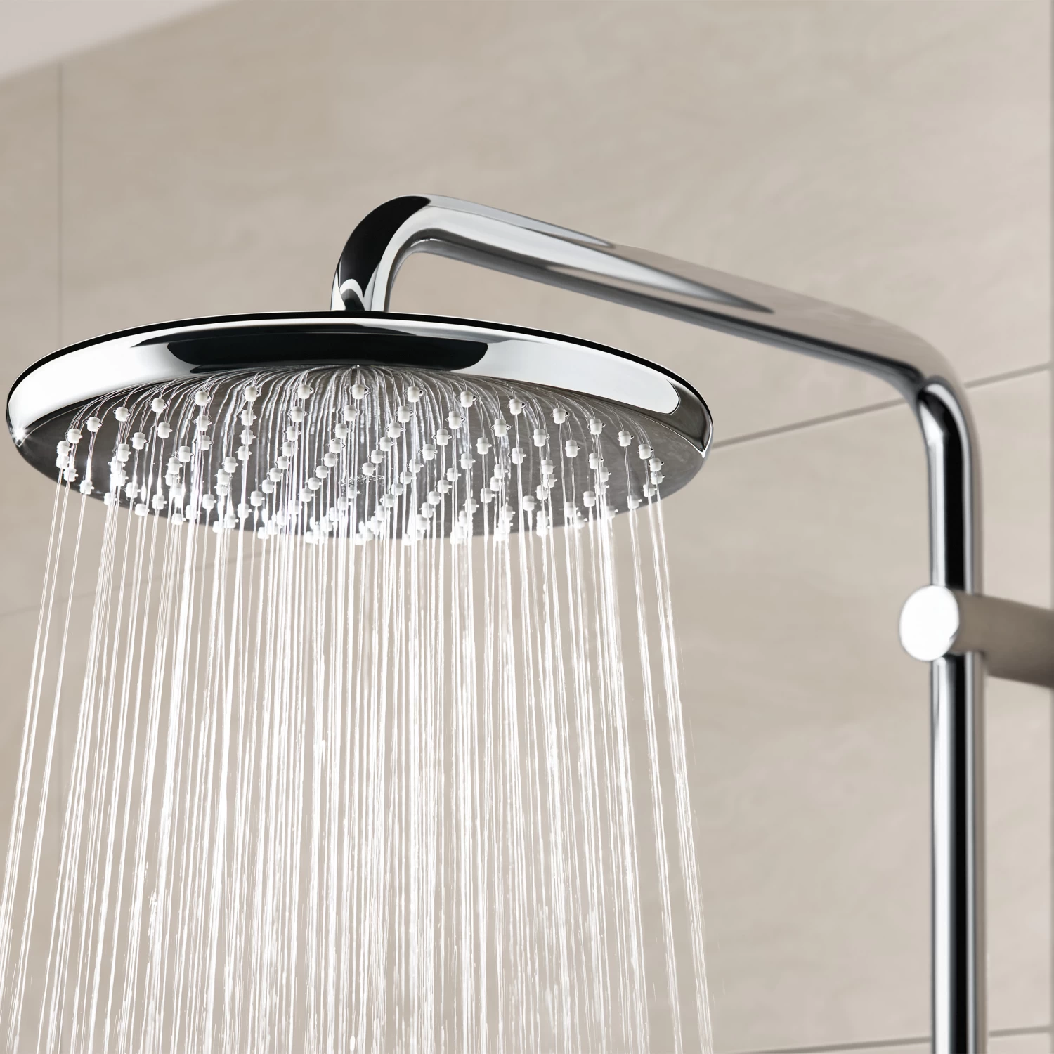 - Grohe DreamSpray®: zorgt voor een volle douchestraal door een gelijkmatige waterverdeling over alle sproeigaatjes