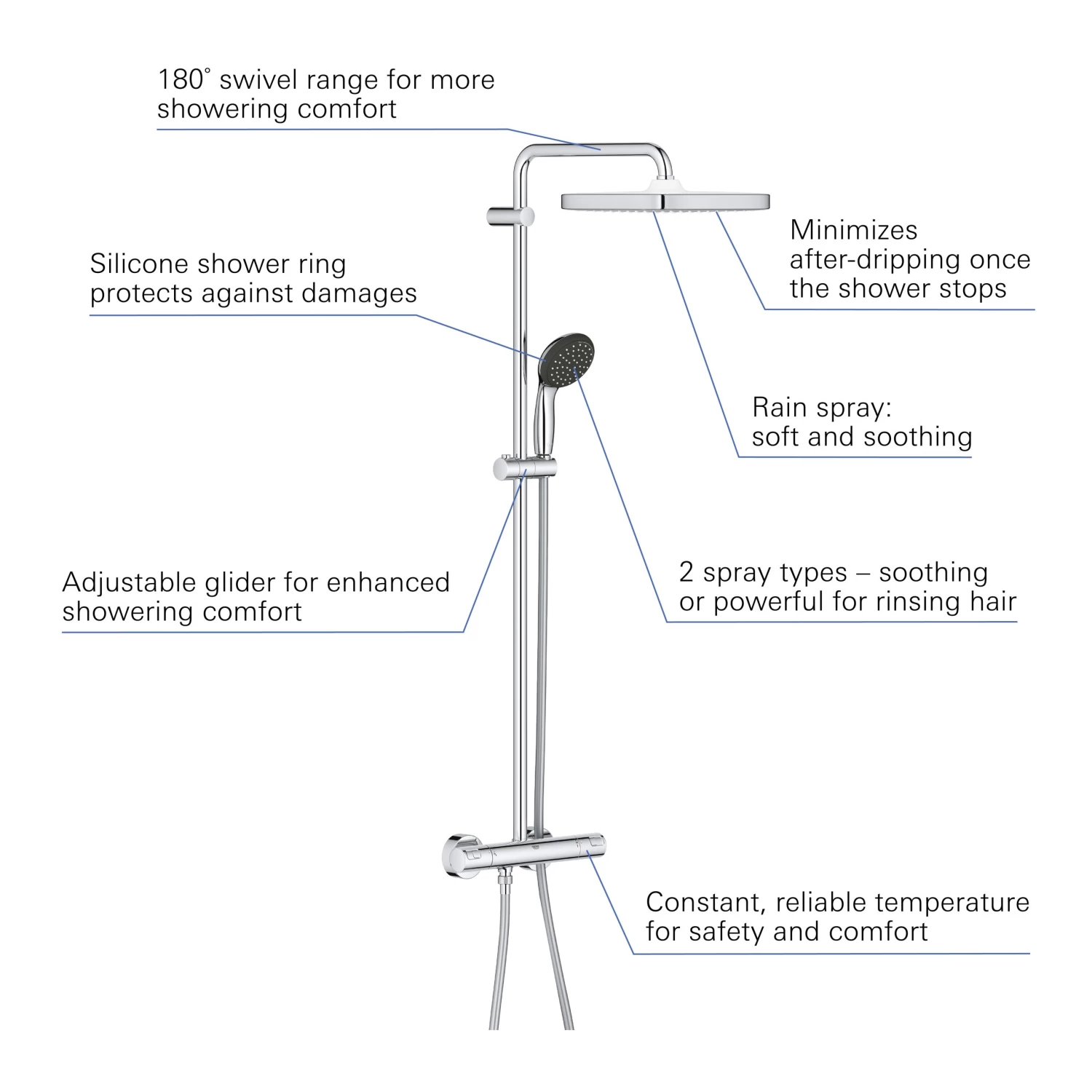 - Grohe DreamSpray®: zorgt voor een volle douchestraal door een gelijkmatige waterverdeling over alle sproeigaatjes