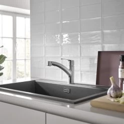Met deze GROHE Start keukenkraan in supersteel (RVS kleur) heb je volledige grip op elke keukentaak. De kraan is gerestyled in een nieuw design, waardoor je geniet van nog meer gemak en comfort. De lage uitloop is uitgerust met een handige Pull-Out Dual Spray, die totale flexibiliteit biedt in de keuken. Of je nu groente wast of pannen afspoelt; met slechts één druk op de knop regel je precies de straalsoort die je nodig hebt. Zo kun je kiezen voor een spatvrije laminaire straal en een Jet Spray met een krachtige waterstraal. De uitloop kun je flexibel 90° draaien en de GROHE SilkMove cartouche garandeert een soepele bediening gedurende de hele levensduur van de kraan. Daarbij biedt deze keukenmengkraan schoon drinkwater dankzij GROHE Zero, die ervoor zorgt dat het kraanwater niet in aanraking komt met lood en nikkel. Ook ga je duurzaam om met je waterverbruik via de instelbare debietbegrenzer én is de keukenkraan veilig in gebruik voor het hele gezin dankzij de geïntegreerde temperatuurbegrenzer. De matte afwerking in supersteel is slijtvast en beschermt de eengreepskraan optimaal tegen krasvorming. Met de handige GROHE FastFixation Plus montageset installeer je de GROHE Start keukenkraan in een handomdraai én zonder gereedschap! Let op: een druk van minimaal 1,0 bar wordt voor deze kraan geadviseerd.