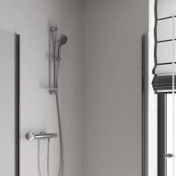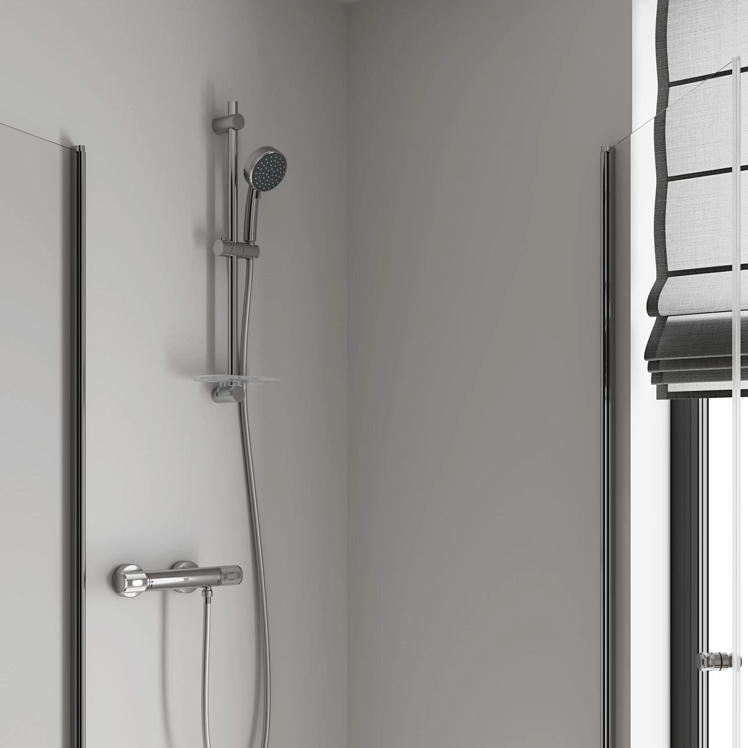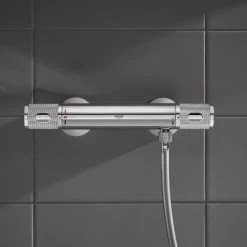 De Grohe Thermostatische Douchekraan Precision Trend New Chroom 15 cm is geschikt voor badkamers waar de hart-op-hart afstand tussen de koud- en warmwaterleiding 150 mm is. Deze thermostatische douchekraan zorgt voor een heerlijke douche met een constante watertemperatuur, ook al zijn er fluctuaties in de waterdruk. De kraan is voorzien van GROHE TurboStat: hiermee wordt snel en continu de gewenste temperatuur bereikt. De kraan beschikt over GROHE CoolTouch®, waardoor het binnenkomende hete water wordt omspoeld door koud water en de buitenkant van de thermostaatkraan nooit warmer wordt dan de temperatuur van het douchewater. Met de SafeStop knop op 38°C voorkom je dat je kinderen de temperatuur verhogen, terwijl je dankzij de volumegreep met GROHE EcoButton tot 50% water kunt besparen. De robuuste ergonomisch gevormde metalen grepen zorgen tevens voor een optimale grip.