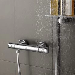 De temperatuurbeveiligingsknop begrenst de temperatuur op 38 graden. Wil je warmer douchen, dan druk je de knop in en draai je de kraan verder open. Zo bespaar je energie, maar zorg je ook dat je niet onverwachts te heet water gebruikt.