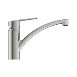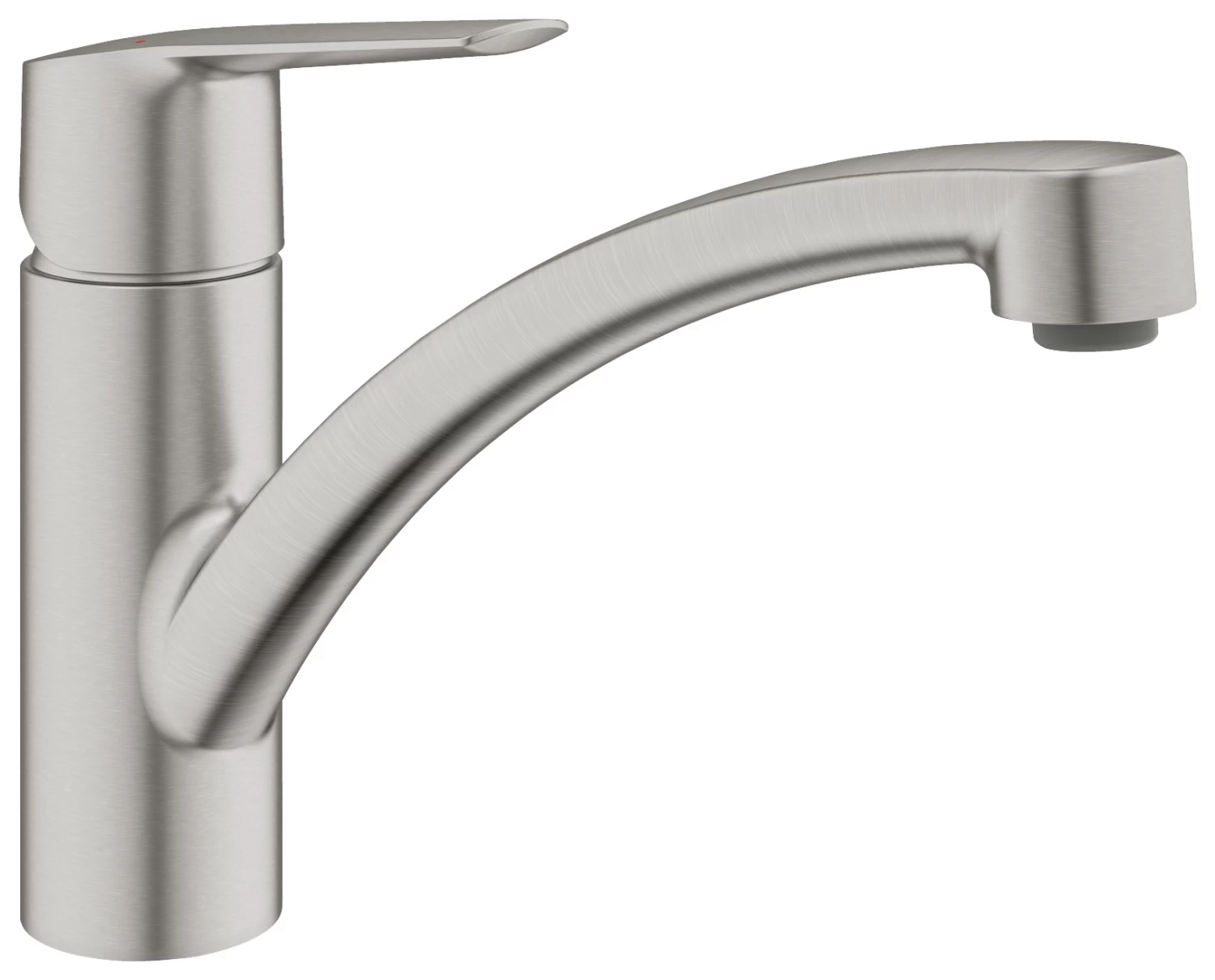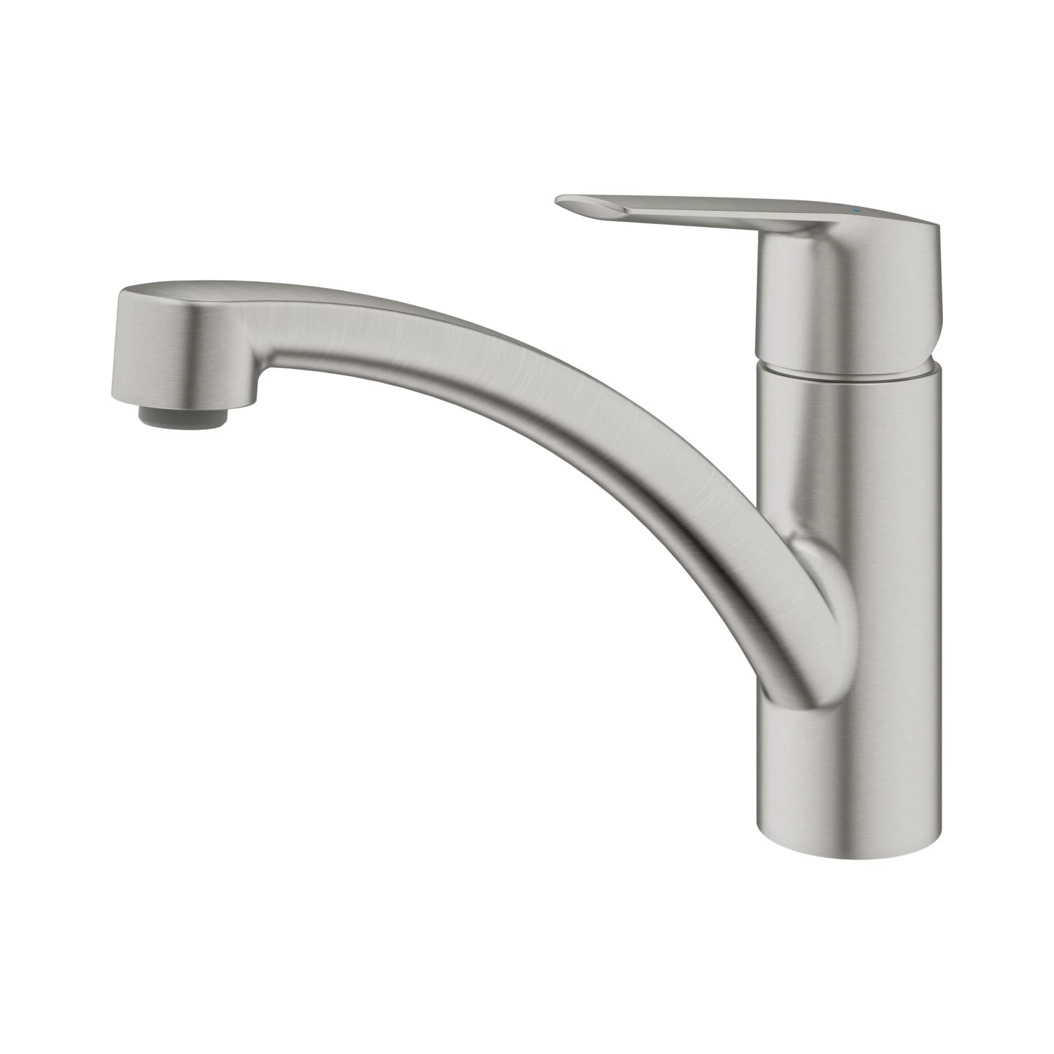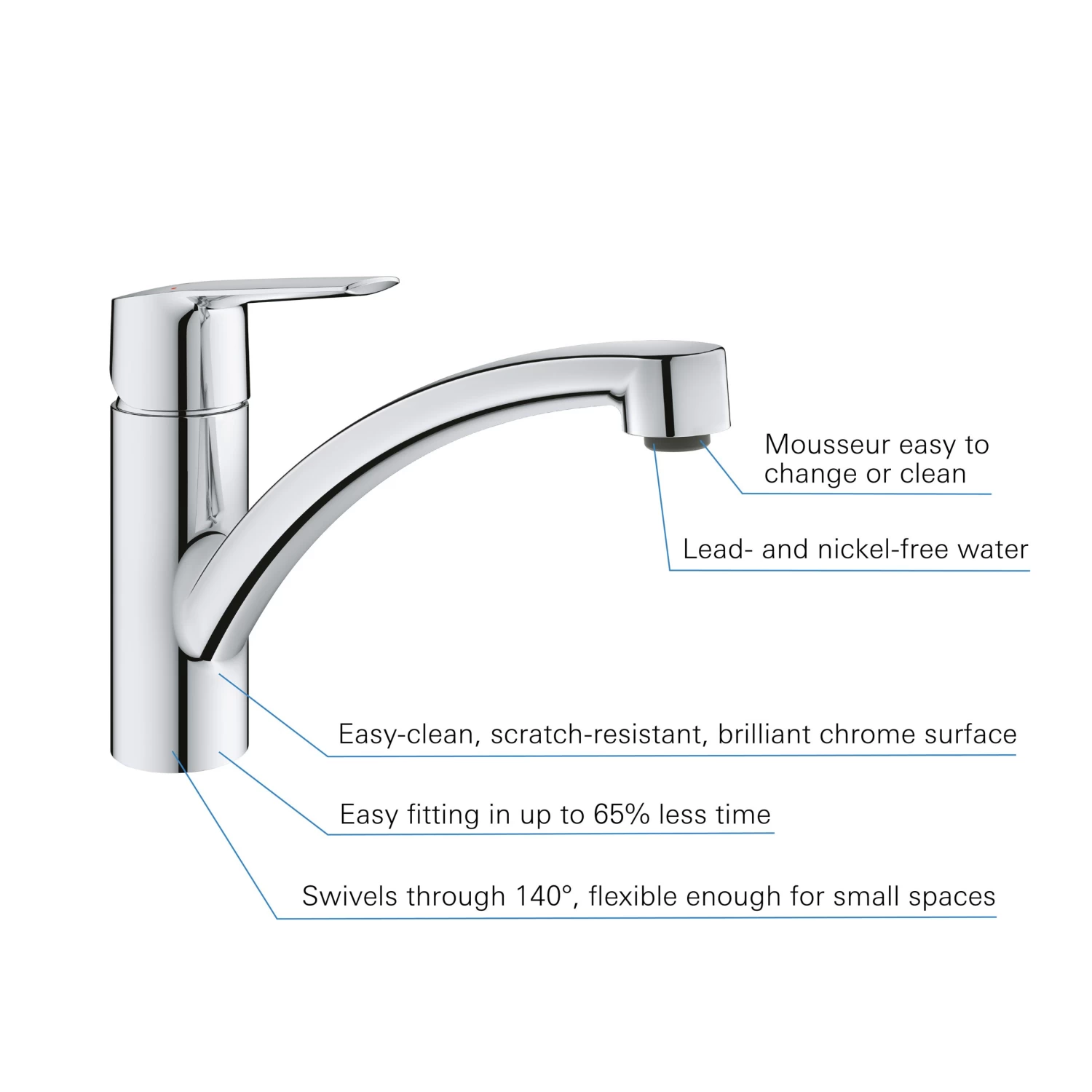 Met de GROHE Start eengreeps keukenkraan breng je je keuken snel en eenvoudig up-to-date dankzij het nieuwe montagesysteem. Deze designklassieker is opgefrist om te voldoen aan de eisen van moderne keukens en heeft nu een slank, modern profiel en beschikt over meer gebruikscomfort. Deze keukenkraan is ontworpen voor eengatsinstallatie en de lage uitloop kan soepel 150° worden gedraaid, wat meer flexibiliteit biedt aan de spoelbak zonder dat je op de muren spettert. De mousseur kan eenvoudig worden verwisseld met behulp van slechts een muntje – er komt dus geen gereedschap aan te pas. Binnenin zorgt de technologie van het GROHE SilkMove ES-cartouche voor een levenslange soepele en nauwkeurige bediening terwijl GROHE Zero geïsoleerde binnenwaterwegen zorgt ervoor dat je drinkwater lood- en nikkelvrij is. Een instelbare debietbegrenzer bespaart water en geld terwijl een geïntegreerde temperatuurbegrenzer verbranding voorkomt. De matte, slijtvaste GROHE StarLight-coating maakt gebruik van Physical Vapour Deposition (PVD) waardoor het tien keer meer krasbestendigheid heeft dan gewoon chroom. Met de GROHE QuickFix Plus-set kan de keukenkraan eenvoudig en snel worden geïnstalleerd, zonder dat je gereedschap nodig hebt. Voor deze kraan wordt een minimale druk van 1,0 bar aanbevolen.