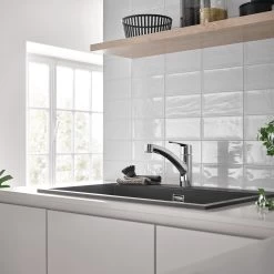 De GROHE Start eengreeps keukenkraan is de perfecte manier om met gemak een nieuwe stijl en verbeterde functionaliteit toe te voegen aan je keuken. Deze designklassieker is opgefrist om te voldoen aan de eisen van moderne keukens en heeft nu een slank, modern profiel en beschikt over meer gebruikscomfort. Deze keukenkraan is ontworpen voor eengatsinstallatie. De lage uitloop is voorzien van een Pull-Out Dual Spray die je maximale bewegingsvrijheid geeft en met één druk op de knop schakelt tussen een spatvrije laminaire straal en een krachtige Jet Spray –deze handige sproeikop zorgt dat je met gemak groenten afspoelt, pannen vult of de spoelbak schoonmaakt. De kraan keert automatisch terug naar de laminaire straal, wanneer deze wordt uitgeschakeld. De uitloop kan ook soepel 90° worden gedraaid voor extra gemak in krappe ruimtes. De technologie van het GROHE SilkMove cartouche zorgt voor een levenslange soepele en nauwkeurige bediening terwijl GROHE Zero geïsoleerde binnenwaterwegen zorgt ervoor dat je drinkwater lood- en nikkelvrij is. Een instelbare debietbegrenzer bespaart water en geld terwijl een geïntegreerde temperatuurbegrenzer verbranding voorkomt. De glanzende GROHE StarLight chroom afwerking is krasbestendig en zorgt voor een oogverblindend oppervlak dat lang meegaat. Met de GROHE QuickFix Plus-set kan de keukenkraan eenvoudig en snel worden geïnstalleerd, zonder dat je gereedschap nodig hebt. Voor deze kraan wordt een minimale druk van 1,0 bar aanbevolen.