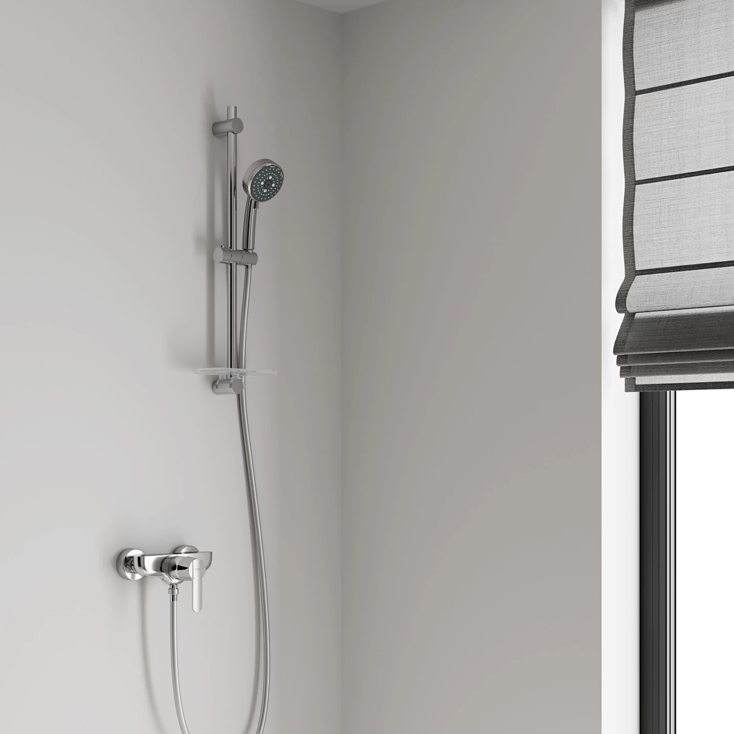 De Grohe Vitalio Comfort doucheset bestaat uit: De Grohe Vitalio Comfort handdouche van 10 centimeter met drie straalsoorten, 175cm Vitalioflex Comfort doucheslang en een glijstang met verstelbare muursteunen en zeepschaal. ij de GROHE Rain O² geven fijne regenstraaltjes het effect van een zomerse regenbui op je lichaam. De GROHE Jet straal is een volle, krachtige straal die de huid tot in de puntjes stimuleert. Bij de GROHE Massage straal zorgen pulserende waterstoten voor een aangenaam tintelende ervaring. Daarnaast zorgt GROHE DreamSpray® technologie voor een perfecte verdeling van het water. GROHE TwistFree voorkomt het meedraaien van de doucheslang waardoor deze niet kan knikken.