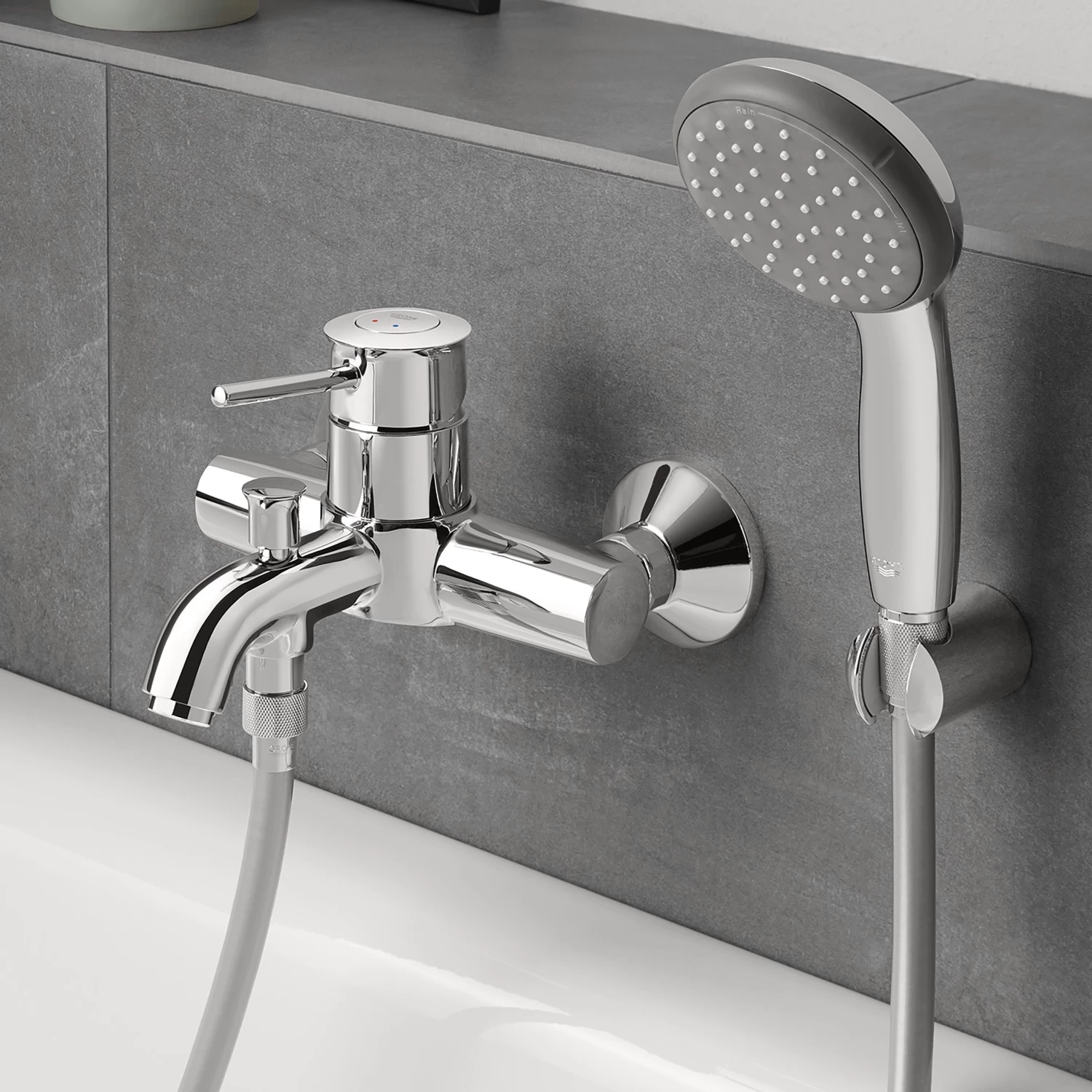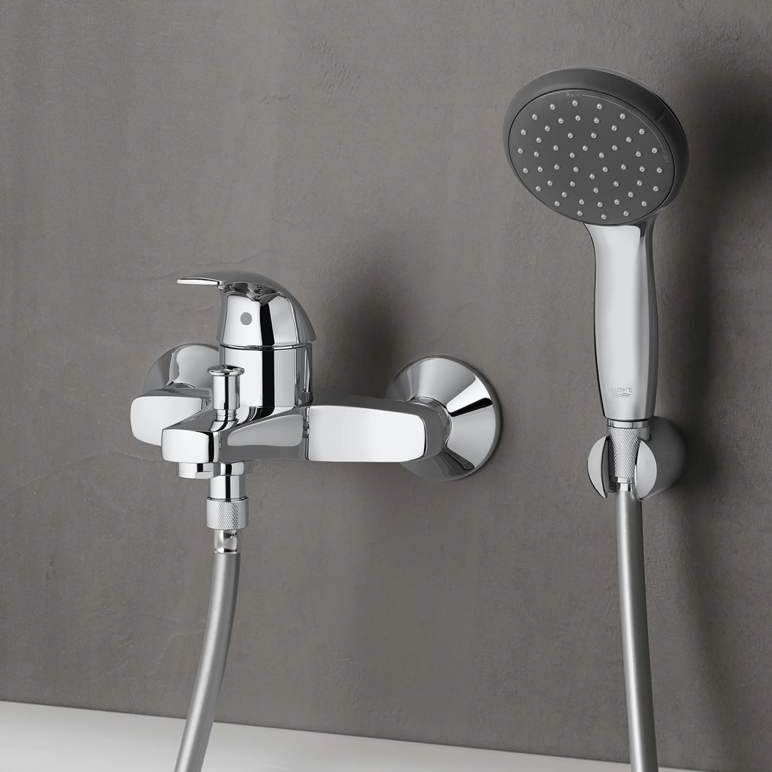 De GROHE Vitalio Start II douchekop bestaat uit een Vitalio Start II handdouche, een Vitalio flex trend doucheslang van 175 centimeter en een wandhouder.