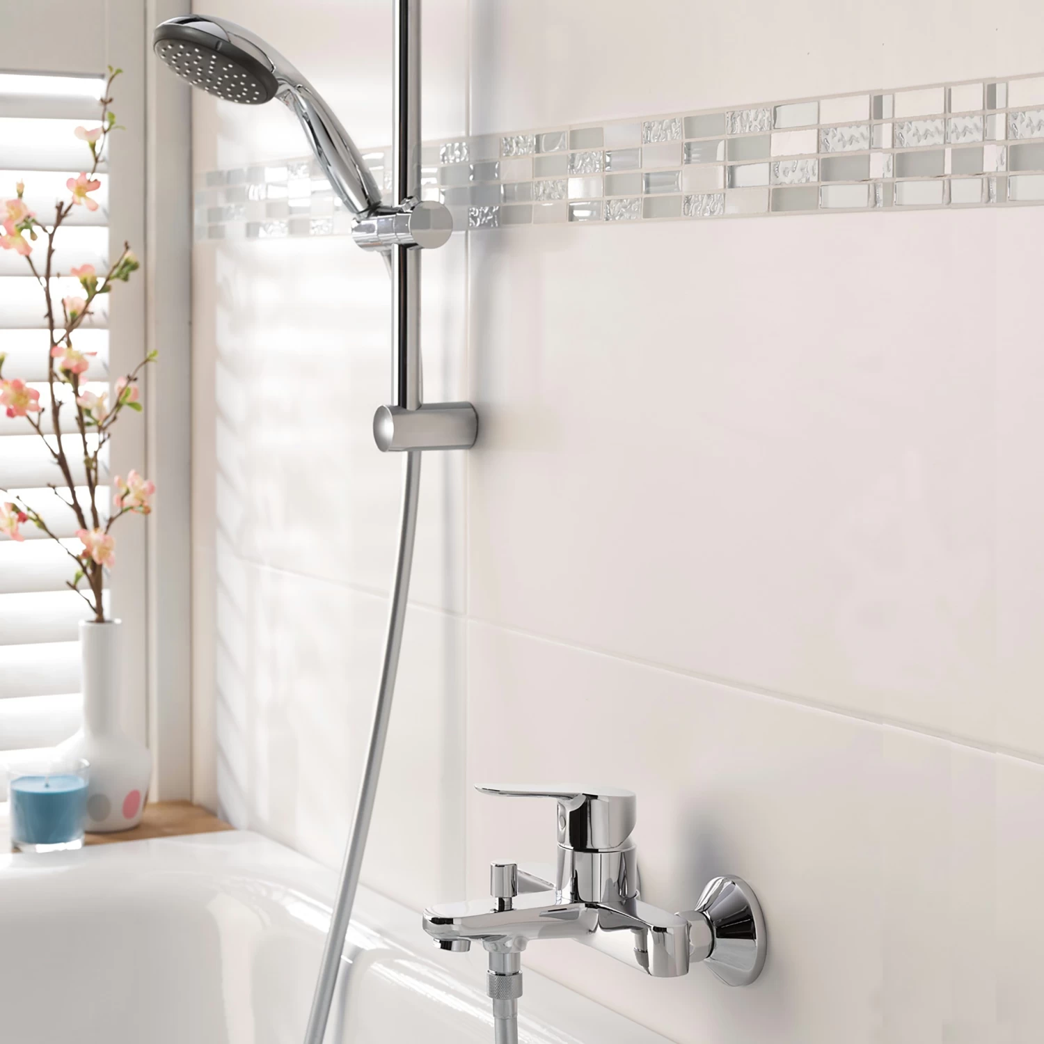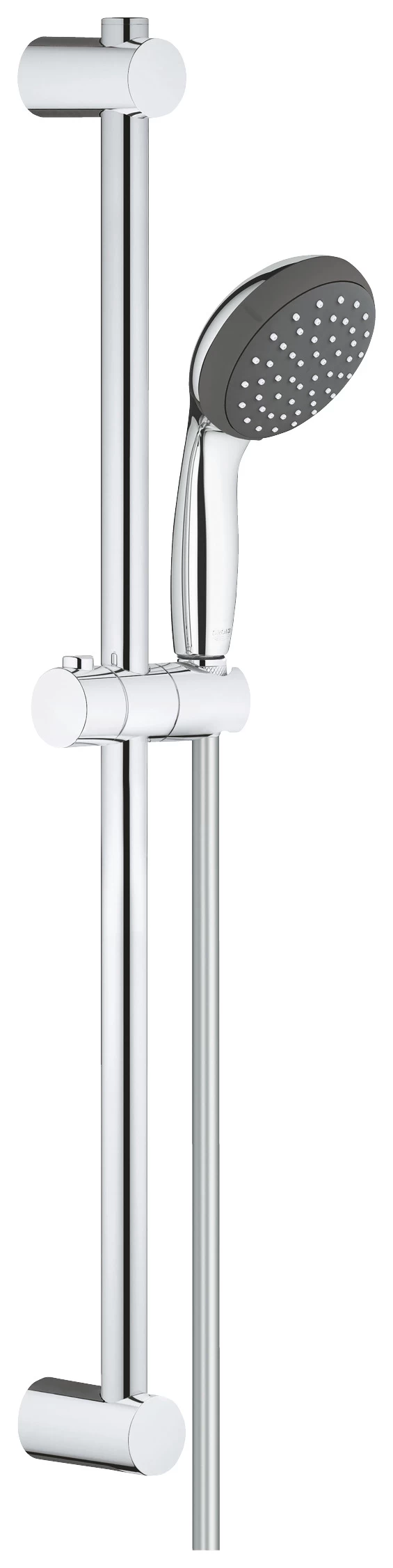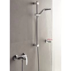 De GROHE Vitalio Start I doucheset best uit: Grohe Vitalio Start I handdouche van 10 centimeter en één stand, 175cm doucheslang met antitwist en een glijstangset met verstelbare muursteunen.