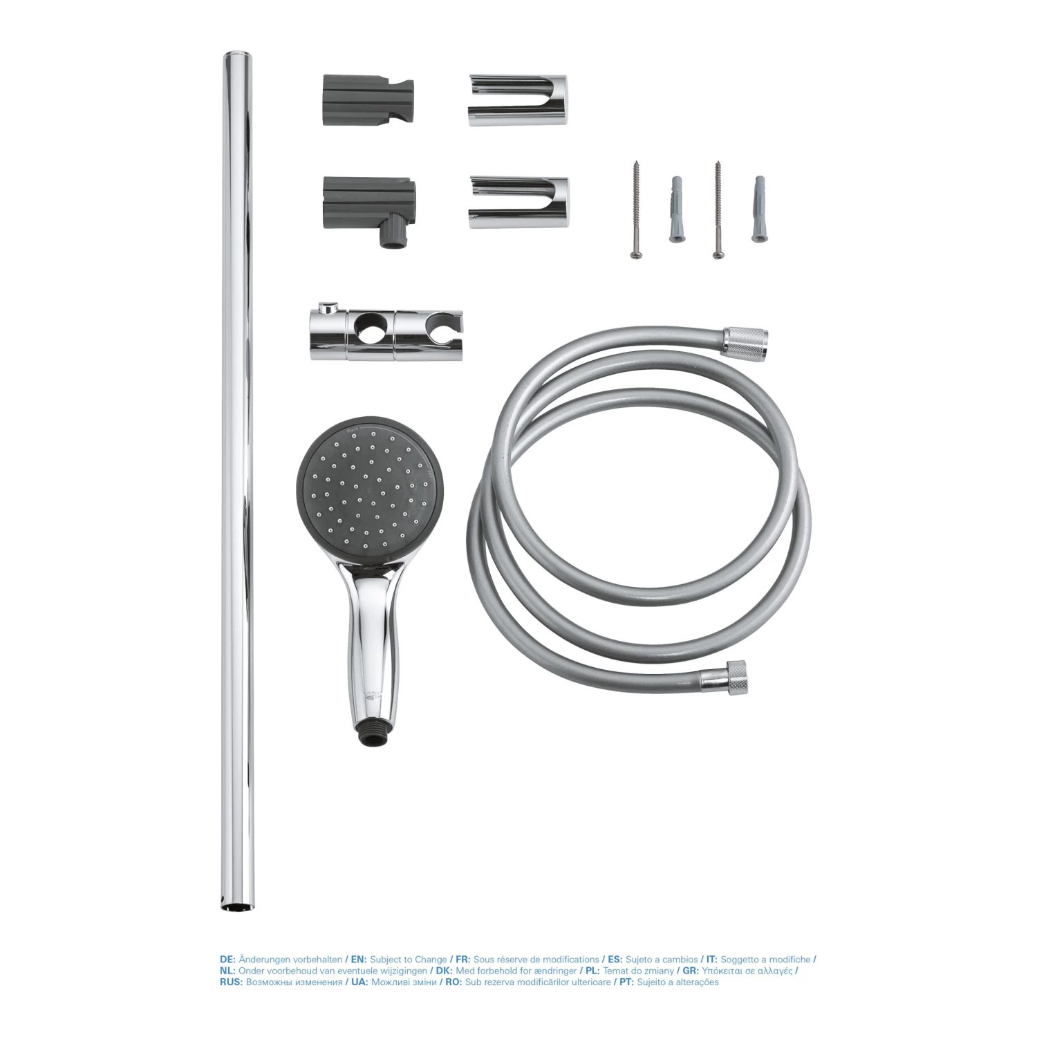 De GROHE Vitalio Start 2 doucheset bestaat uit: Grohe Vitalio Start I handdouche van 10 centimeter en 2 standen, 175cm doucheslang en een glijstang met verstelbare muursteunen.