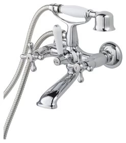 De Handson Louise tweeknops badkraan heeft een sfeervolle en klassieke vormgeving. De badkraan is compleet met bijpassende handdouche en doucheslang. De kraan is tevens voorzien van keramische schijven die zorgen voor een soepele en nauwkeurige bediening van de knoppen. In tegenstelling tot kranen met kraanleertjes, vergen keramische schijven nauwelijks onderhoud. Met de omstelknop aan de bovenzijde van de kraan kan je watertoevoer regelen voor je baduitloop of je douche uitloop.