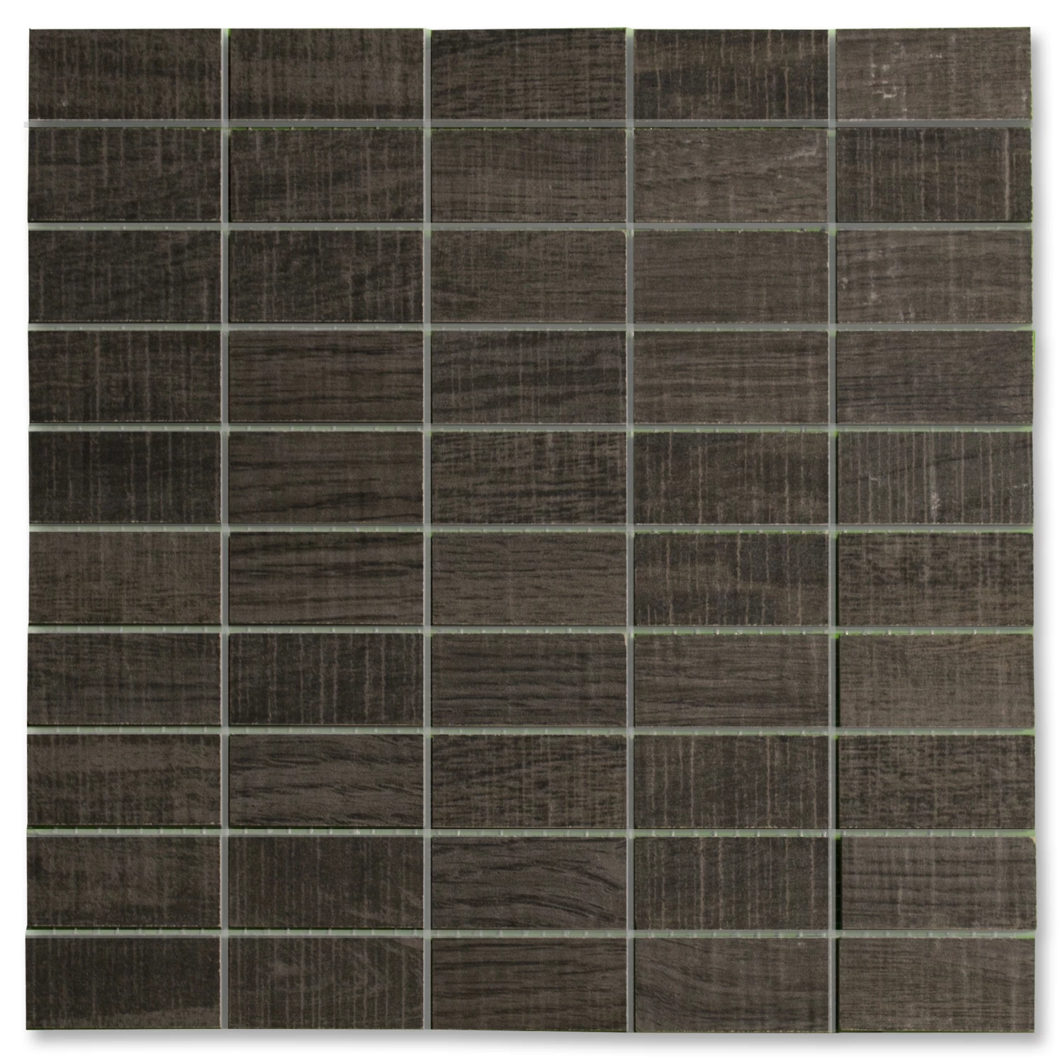 Donkergrijze mozaïek wandtegel met houtlook effect. Passend bij de wandtegel in formaat 20×60. Geschikt voor binnen
