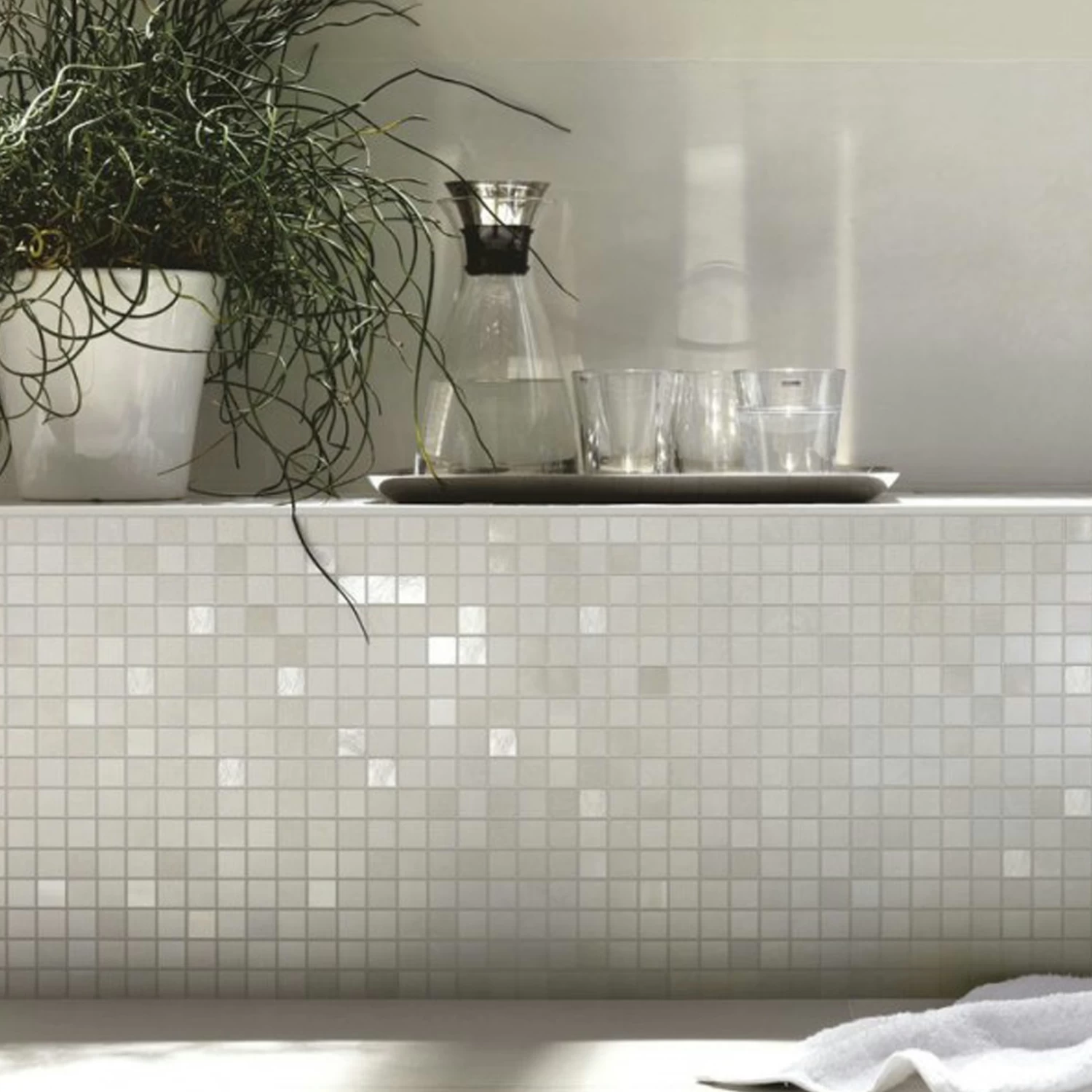 Wit glasmozaïek. Geschikt voor de wand in de badkamer, of het toilet.