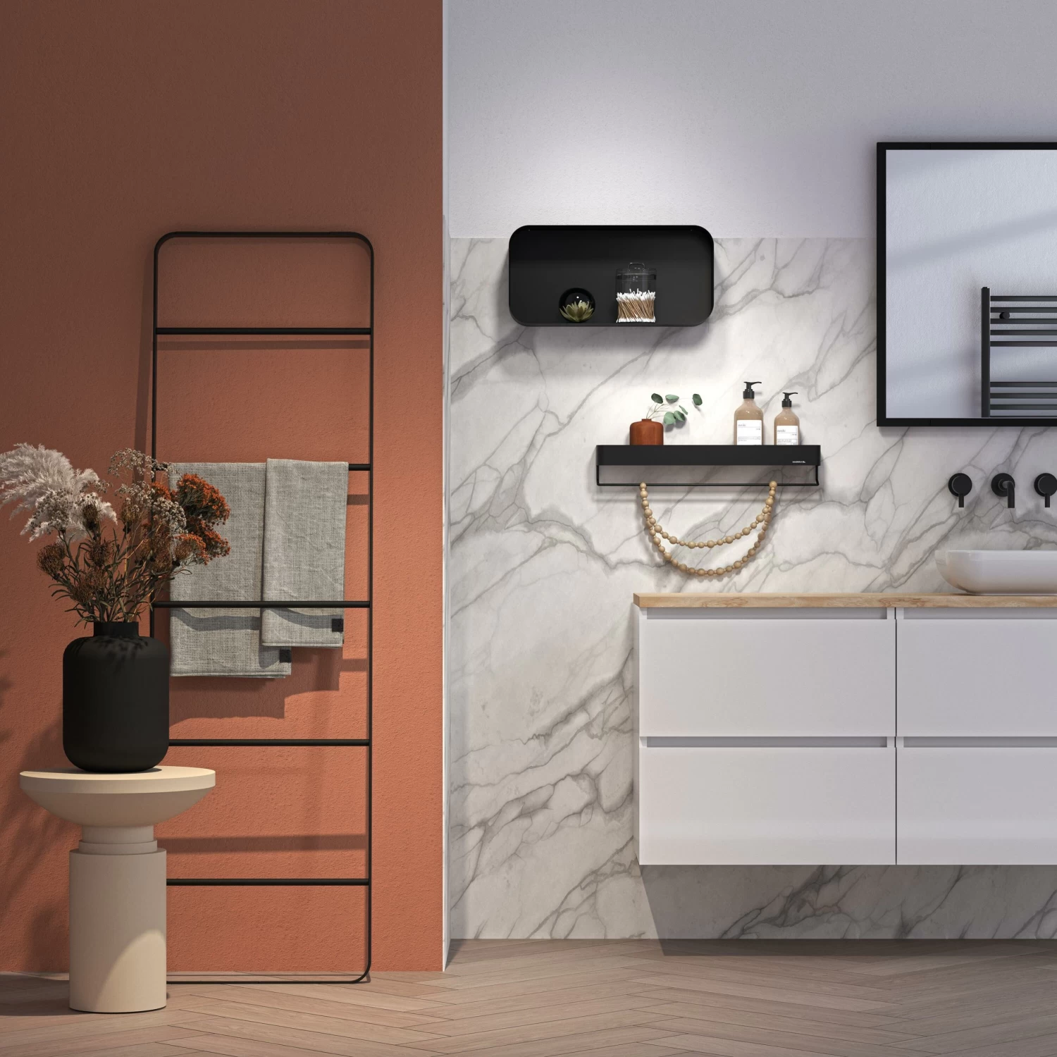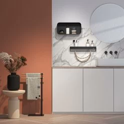 Dankzij de rails onder de plank kun je ook diverse handdoeken kwijt.