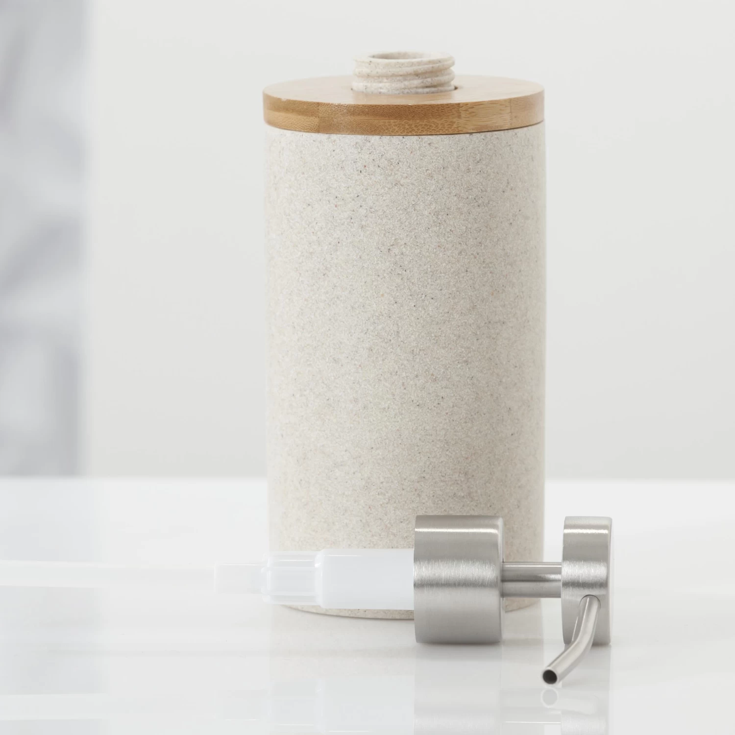 Gecombineerde materialen is de trend van nu. De Grace serie, zandkleurig polyresin gecombineerd met bamboe accenten, sluit daar perfect bij aan. De zeepdispenser is eenvoudig te reinigen met een vochtige doek.