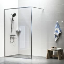 De inloopdouche A3 Contour RVS 98x200cm heeft een minimalistisch kader wat afgewerkt is met geborsteld RVS. De douchewand heeft 6mm dik veiligheidsglas en is voorzien van een antikalk laag. Dankzij deze laag blijft het glas nog langer mooi helder. De inloopdouche wordt geplaatst met een stabilisatiesteun van 1 meter. De steun is tot de gewenste lengte in te korten en ook in een hoek te monteren. Hierdoor past de Inloopdouche A3 Contour RVS 98x200cm in bijna iedere badkamer.