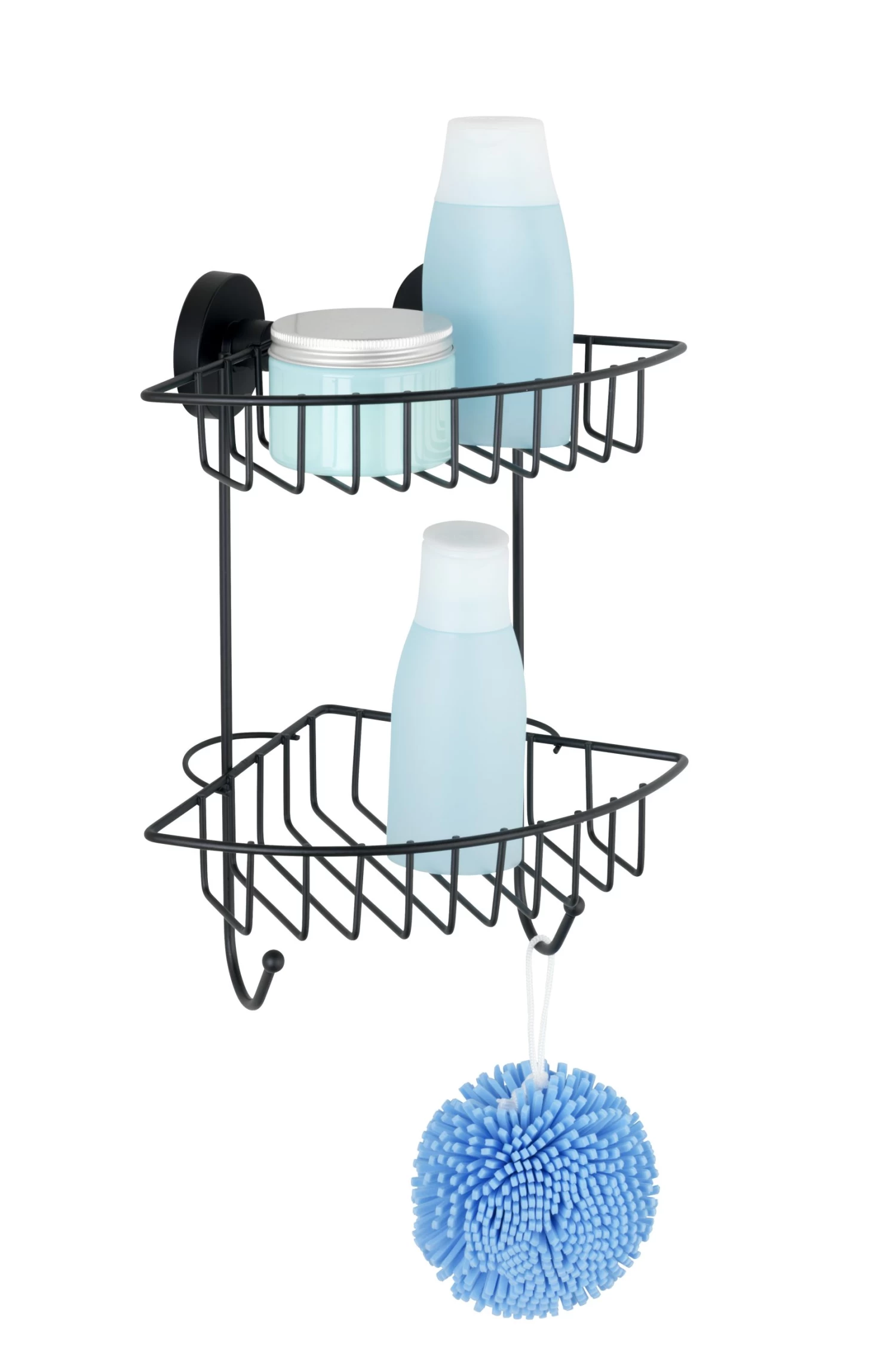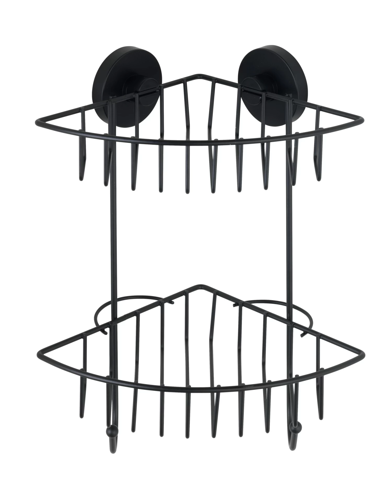 Het doucherek Bari van zwart mat bestaat uit twee etages in mat zwart staal en zorgt ervoor dat jouw verzorgingsspullen mooi in een hoek worden opgeborgen. Er zijn ook nog 2 haken onderaan het doucherek voor bijvoorbeeld een spons en washandje. Met het unieke bevestigingssysteem van Vacuum-Loc is montage op de wand erg snel en eenvoudig; Het systeem wordt dankzij de pomp bevestigd zonder boren en schroeven. Met de meegeleverde pomp wordt de lucht uit de adapter/wandsteun gezogen, waardoor er binnenin een vacuüm ontstaat. De Vacuum-Loc serie omvat haken, doucherekken, douchewissers, zeepbakjes, haardrogerhouders en toiletrolhouders.